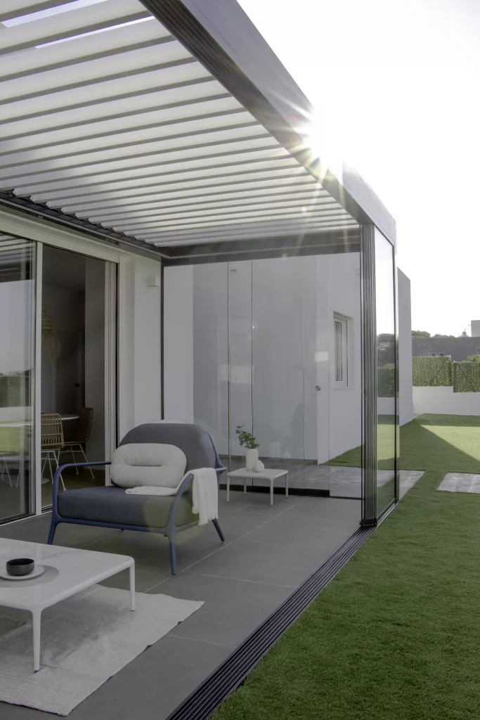 El mando a distancia permite controlar las lamas de la pérgola en 4 posiciones básicas: 0º, 45°, 90°, y 150°. Además, puedes bloquear las lamas en cualquier punto del proceso de apertura, ajustando la cantidad de luz y ventilación según tus necesidades diarias. Esto contribuye a un significativo ahorro energético al regular naturalmente la temperatura de tu espacio.