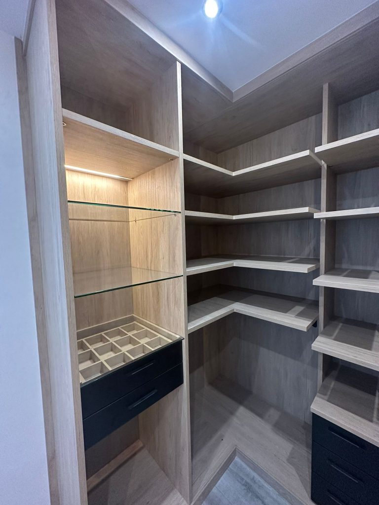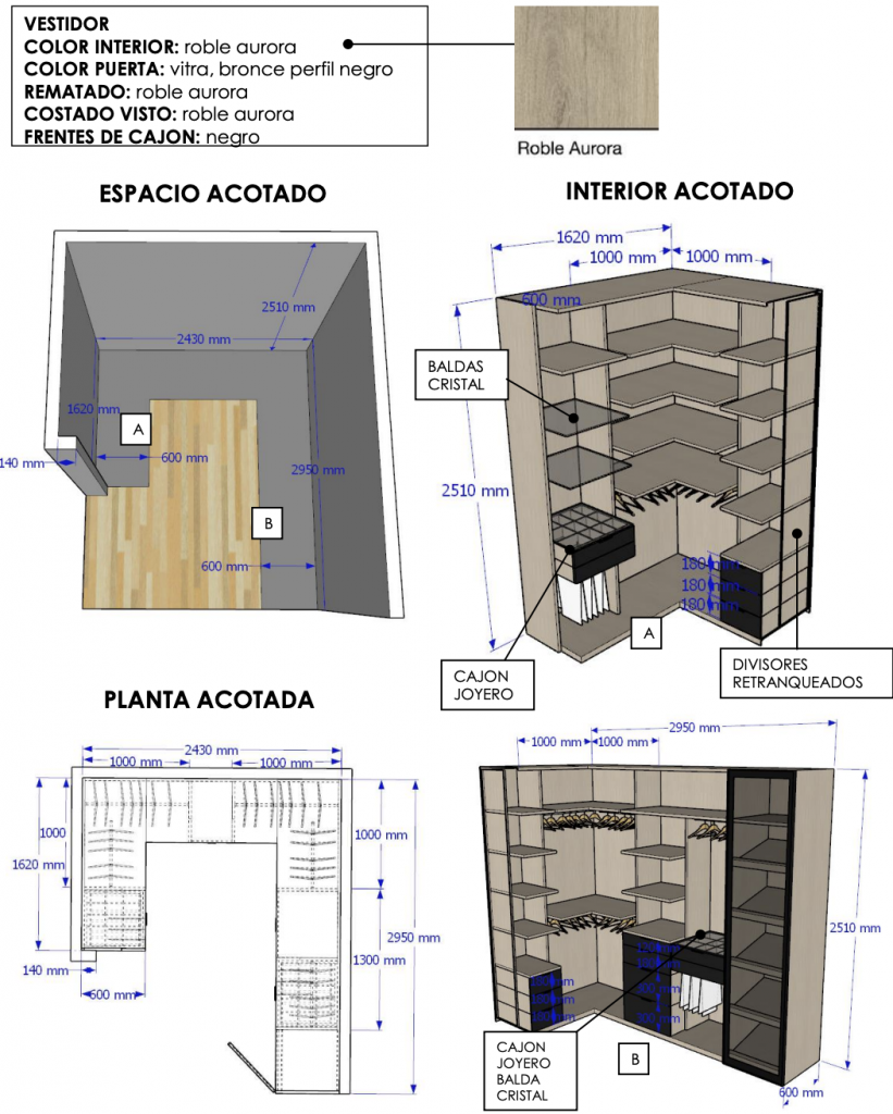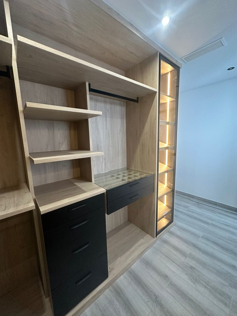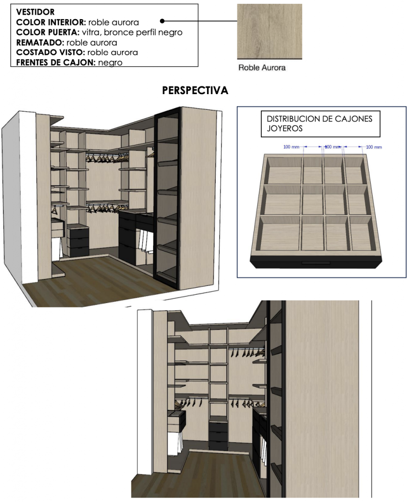 Armario vestidor en roble aurora con vitrina bronce perfil negro.