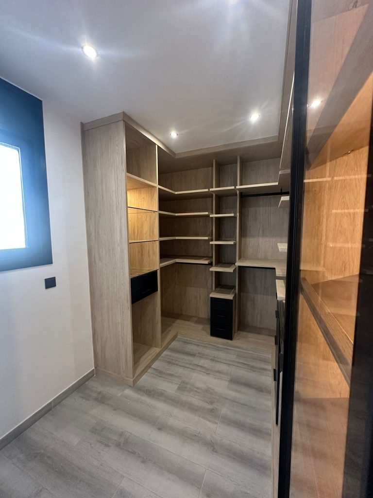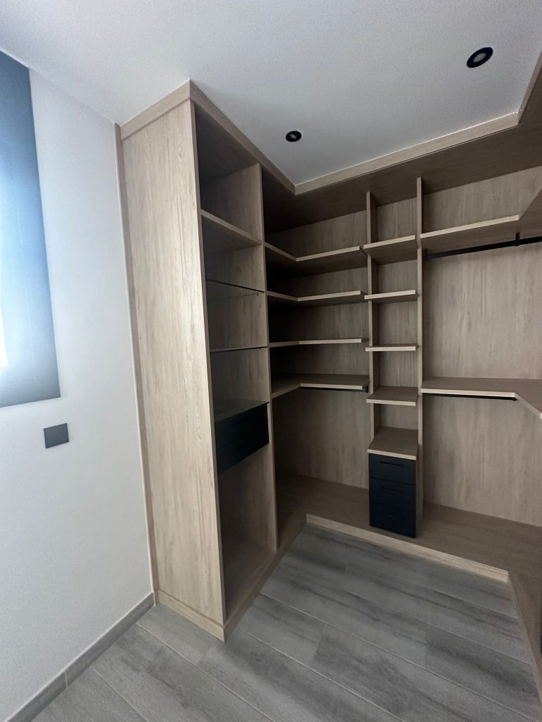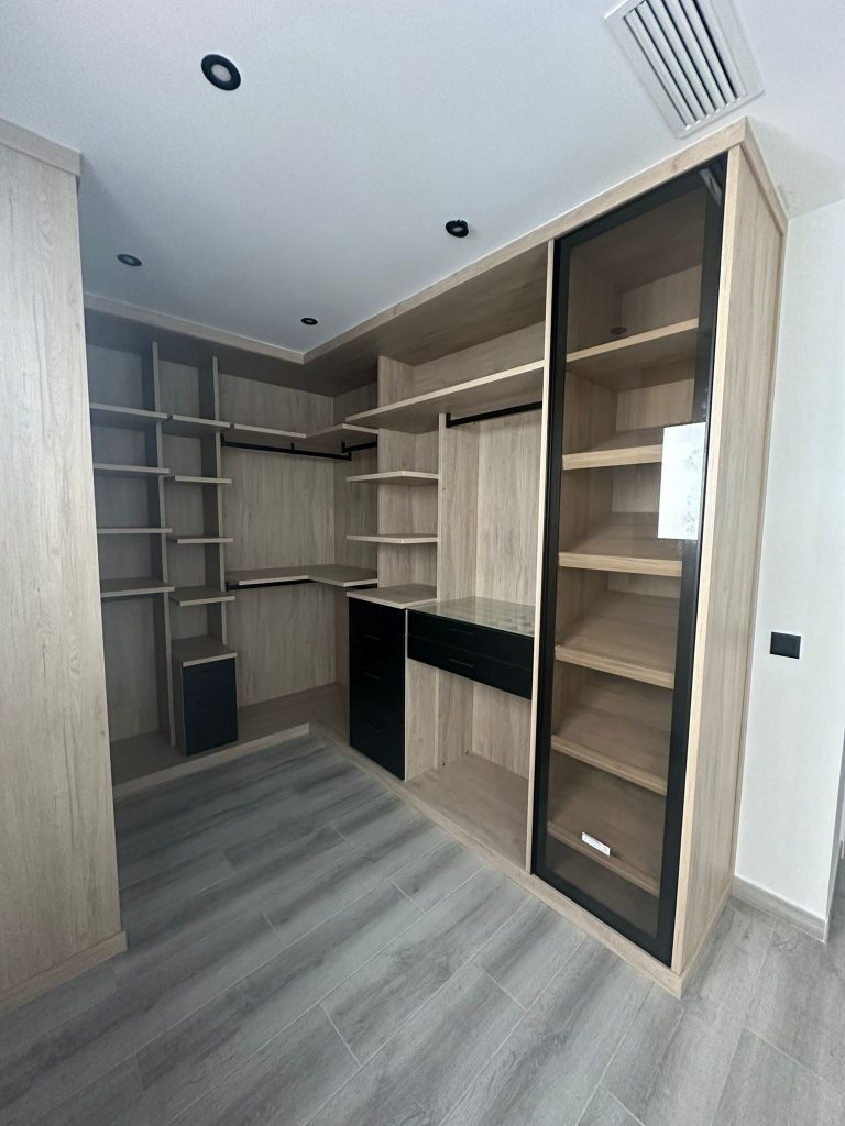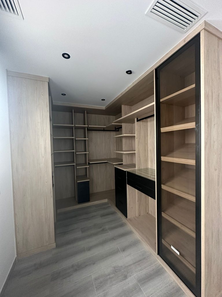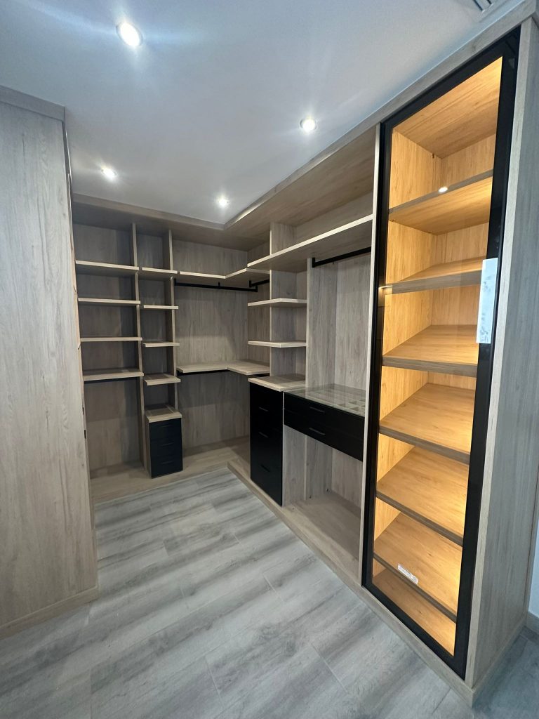 Armario vestidor en roble aurora con vitrina bronce perfil negro.
