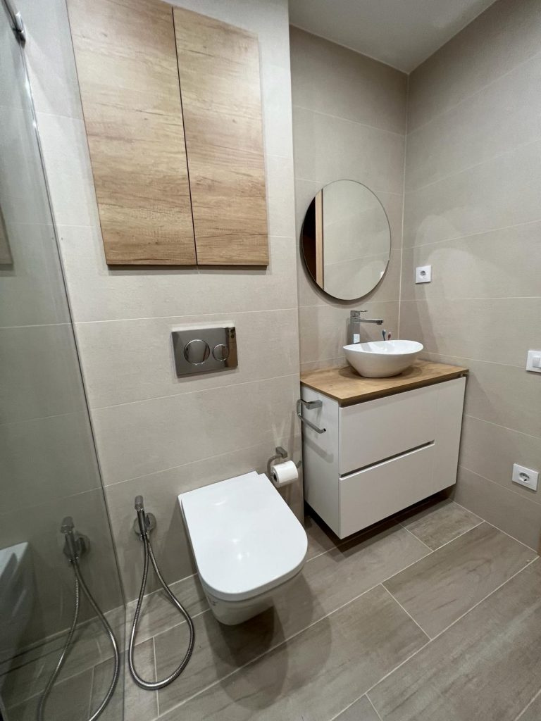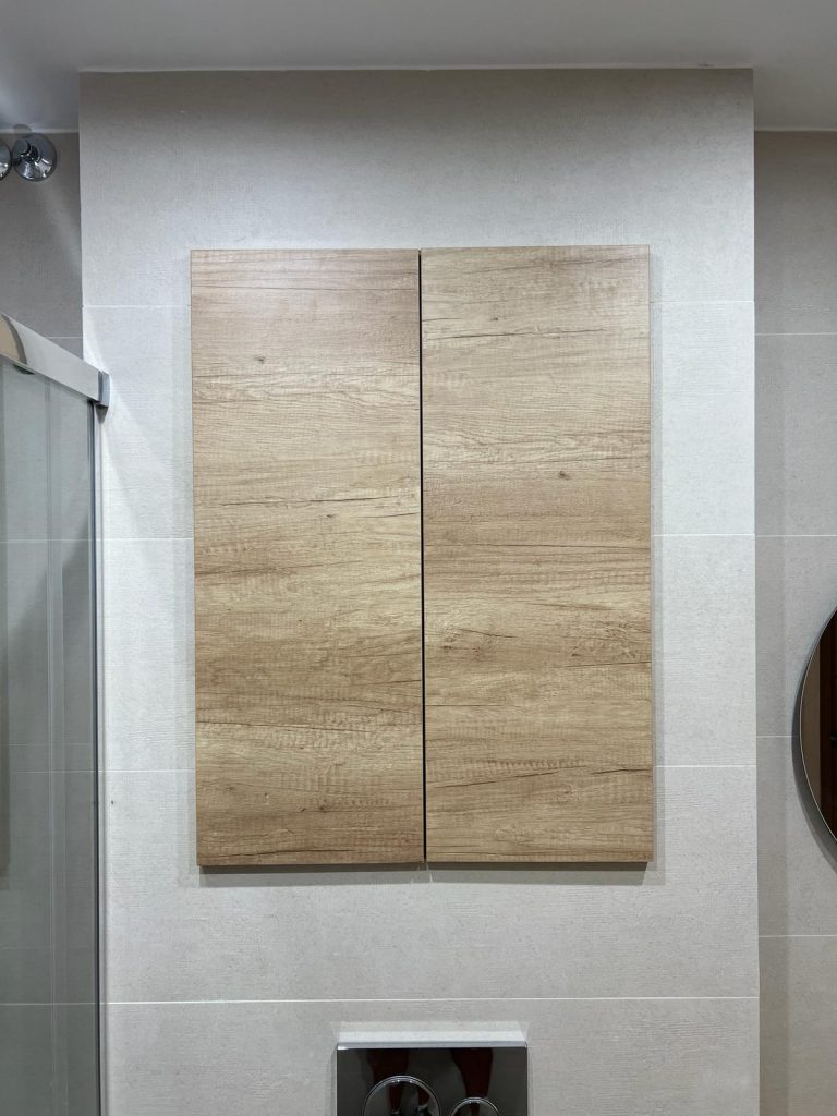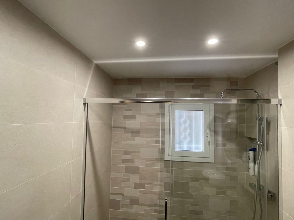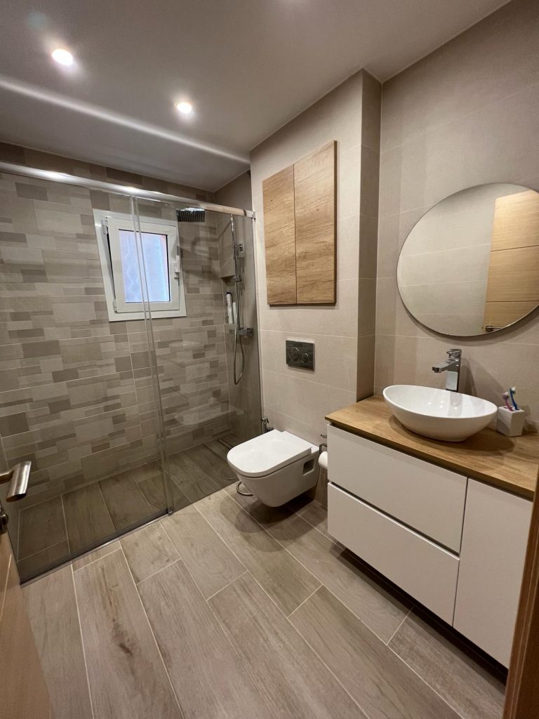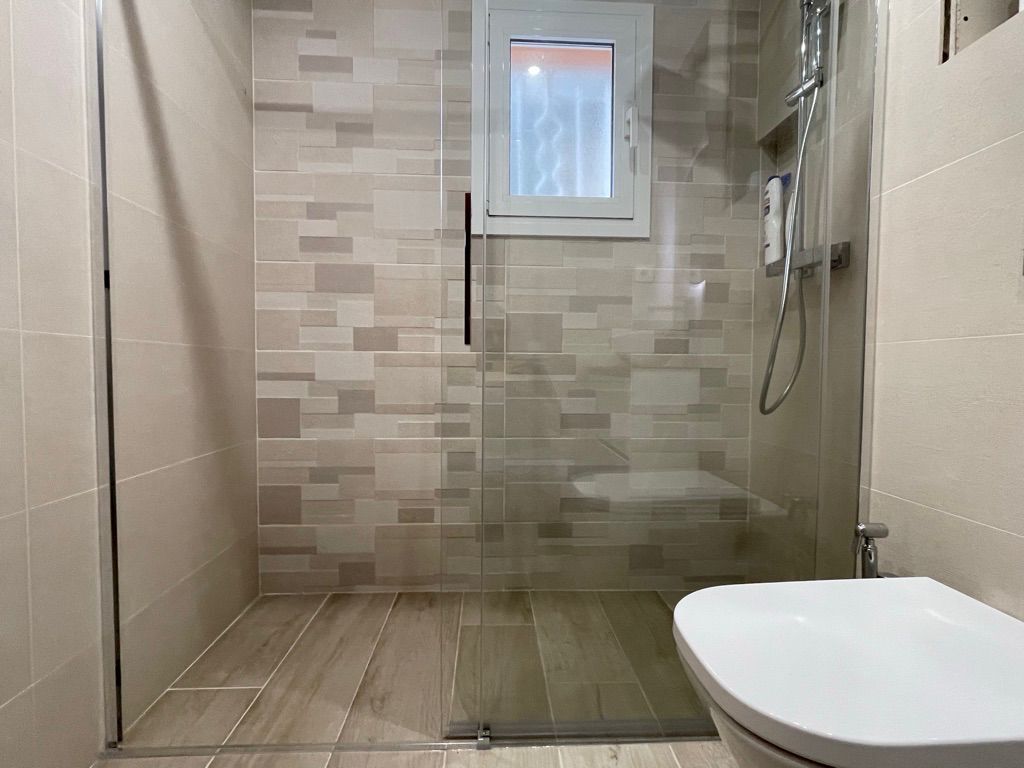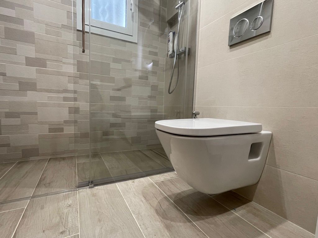 Descubre la excelencia en cada detalle de nuestro diseño de baños. Utilizamos azulejos en porcelánico rectificado para un acabado impecable y duradero. Incorporamos un WC suspendido con cisterna empotrada y pulsador decorativo, junto con un elegante plato de ducha porcelánico con impermeabilización completa de la zona.