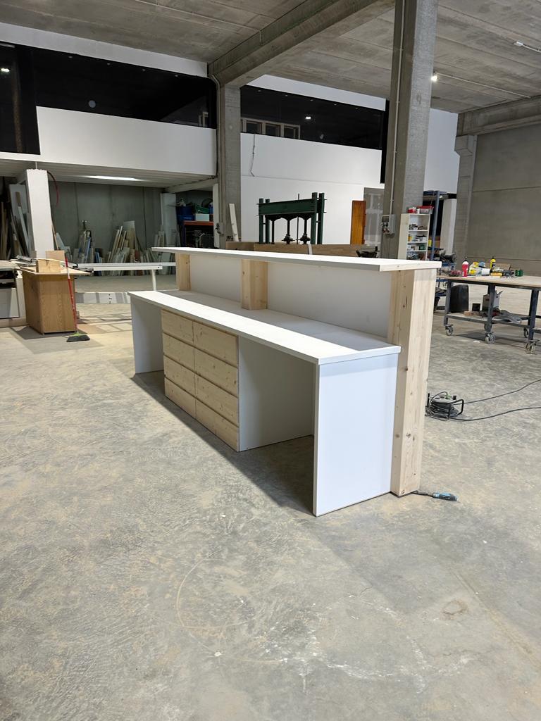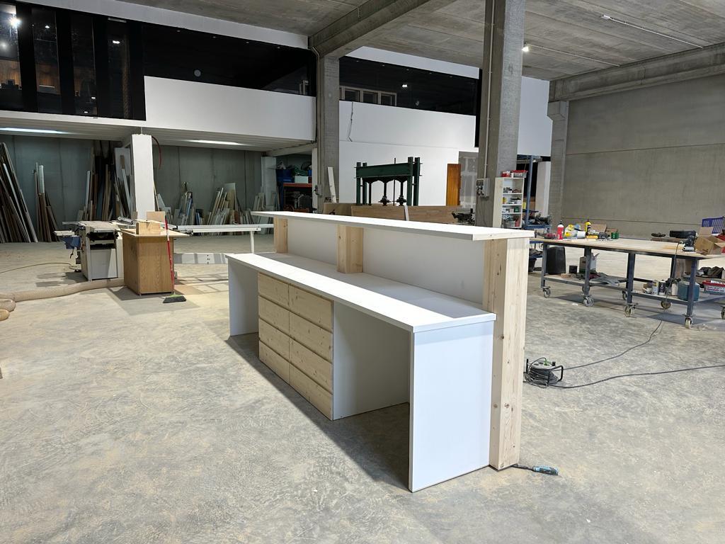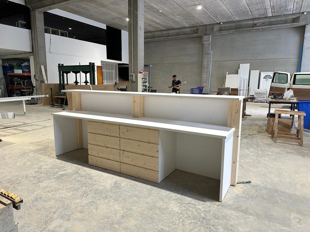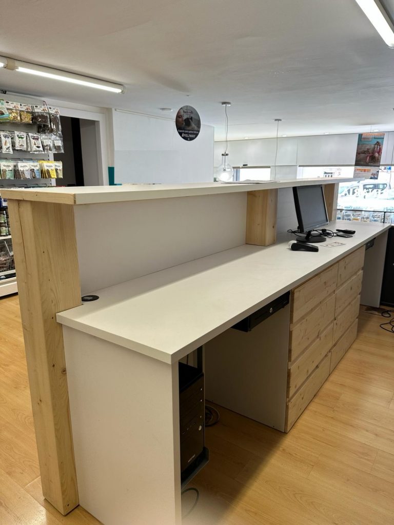 Descubre la perfecta armonía entre estilo y funcionalidad con nuestro mostrador de melamina blanca y madera de pino. Contáctanos hoy mismo para obtener más información y lleva tu negocio al siguiente nivel.