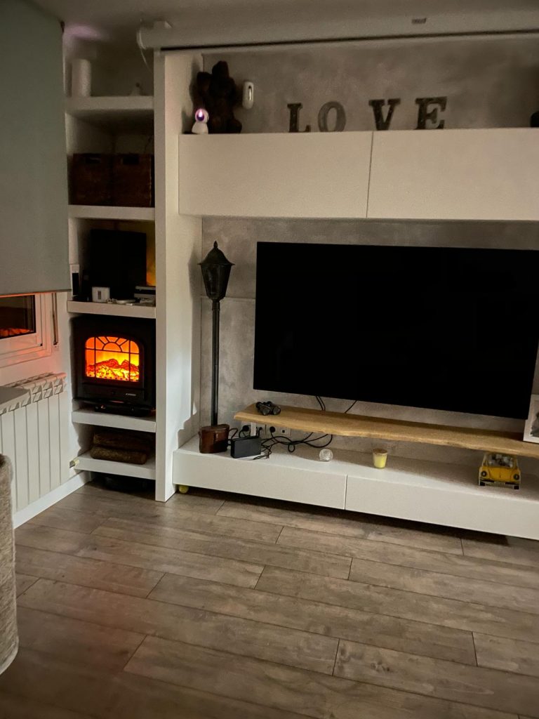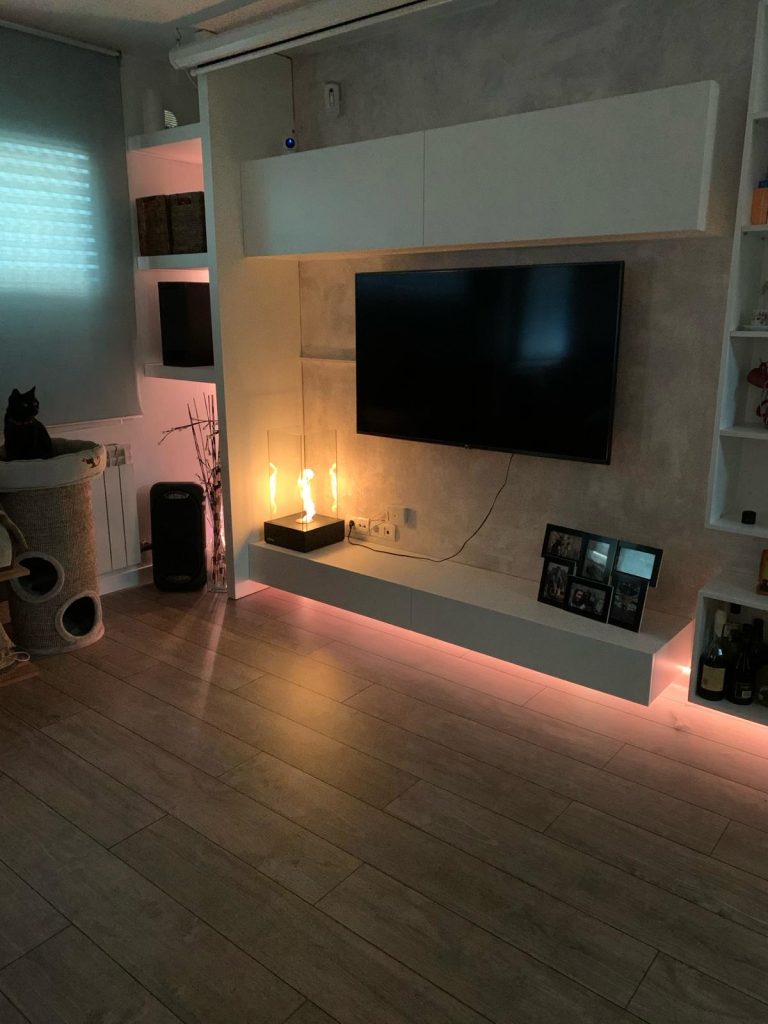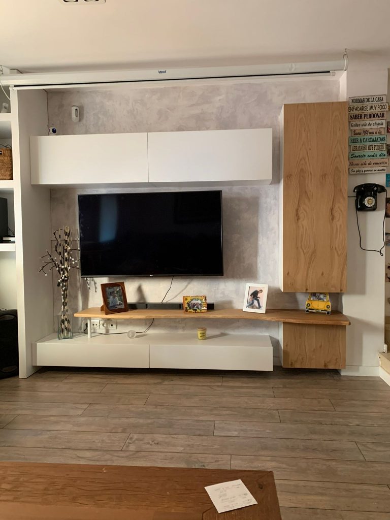 Mueble comedor en laca blanca con roble rústico barnizado en nature mate. Estante de 3cm de roble macizo.