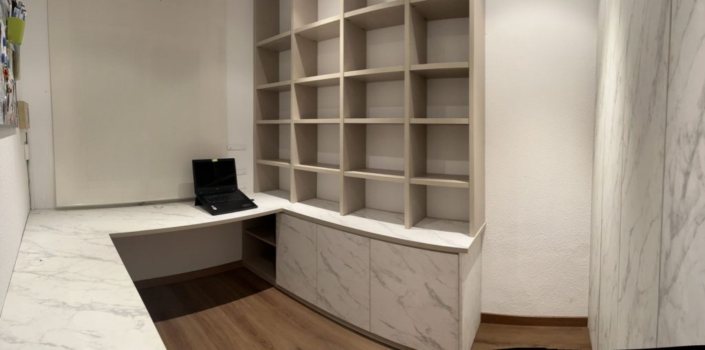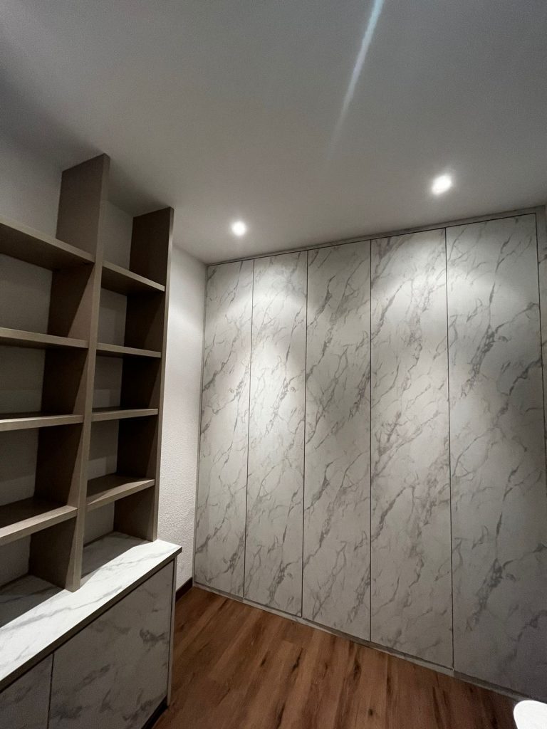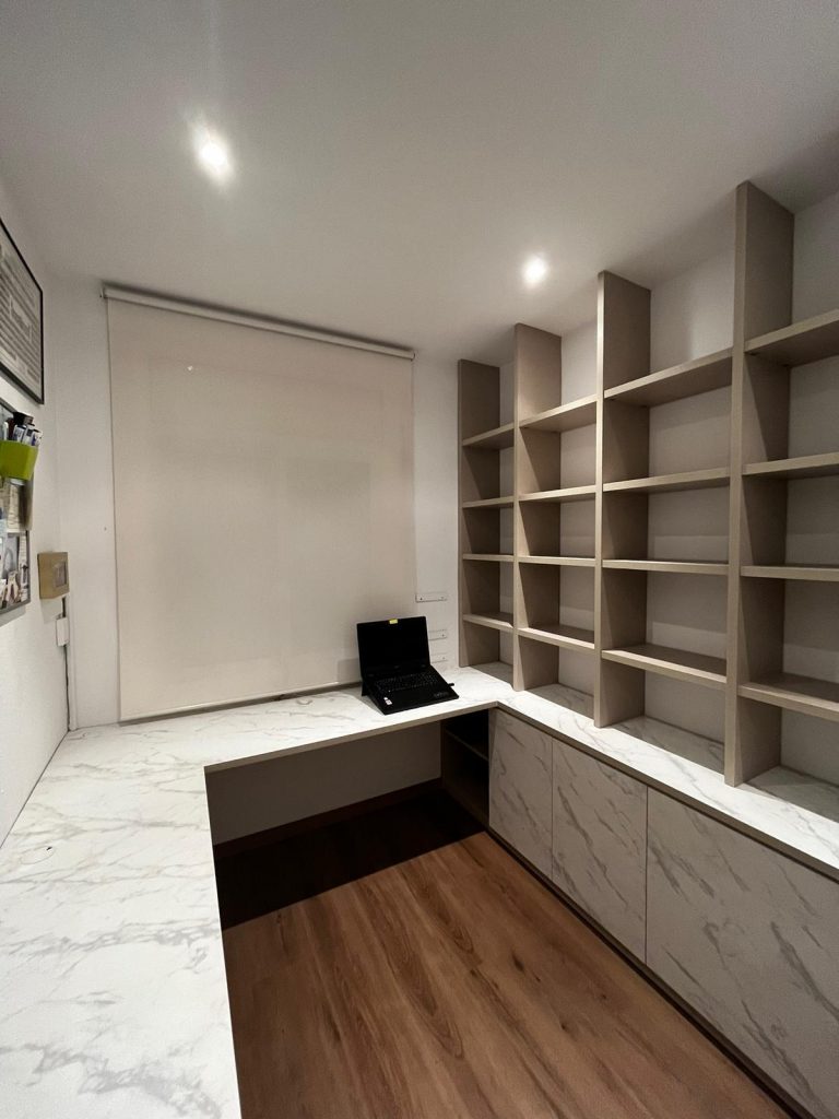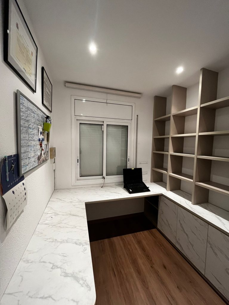 Hemos solucionado la falta de espacio con un escritorio en L con armarios integrados y estanterías. También con un elegante armario que ocupa toda una pared para que no falte espacio para nada.