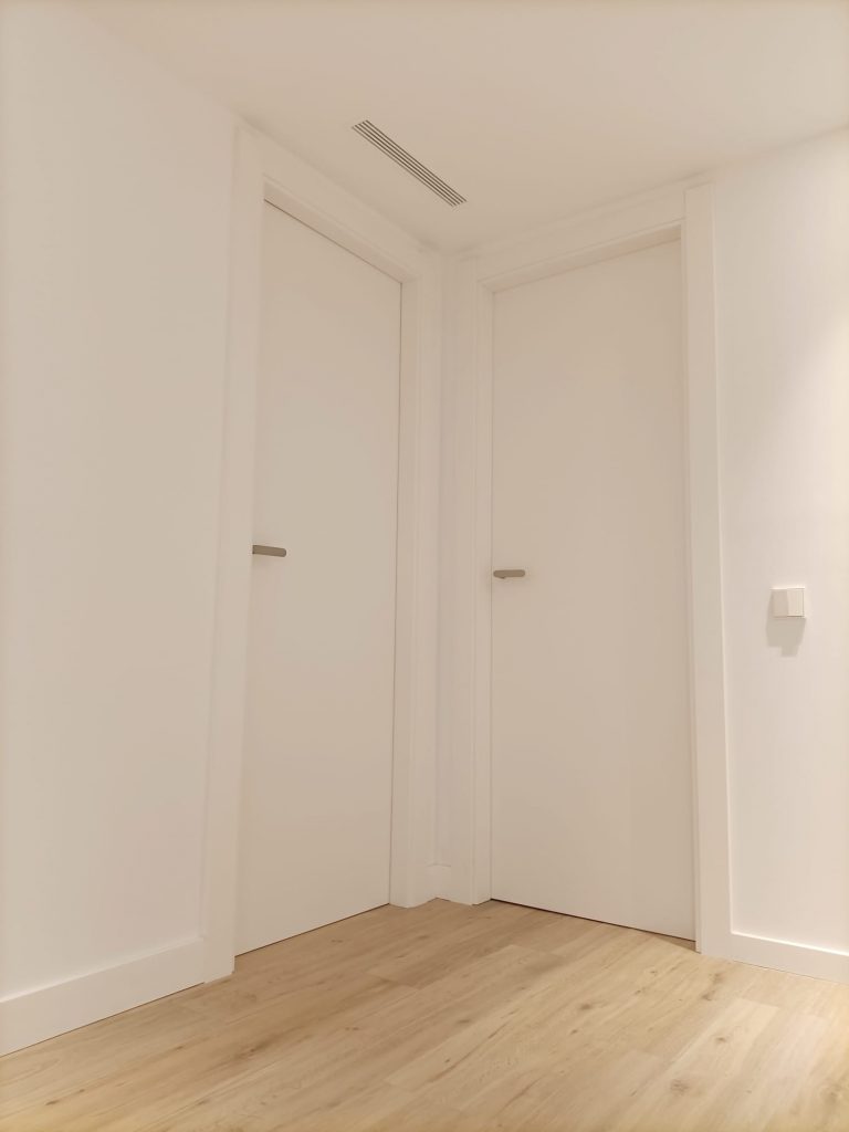 Las puertas lacadas blancas lisas le dan un toque minimalista, limpio y de serenidad al conjunto y los detalles como los tiradores integrados en los armarios aportan un toque moderno y funcional.