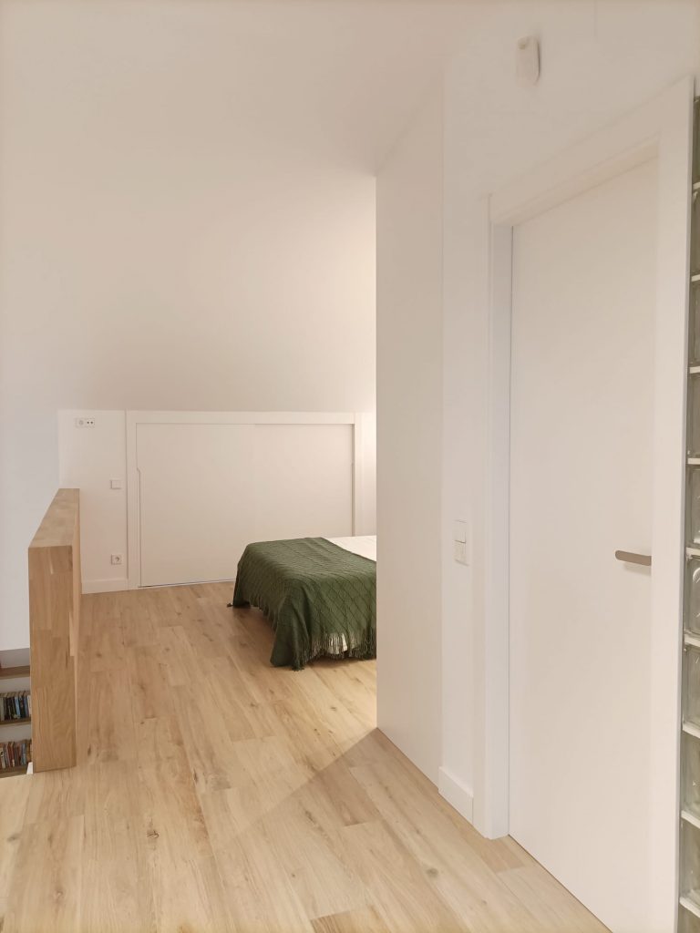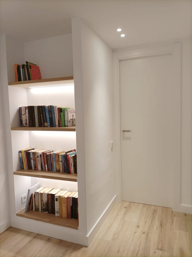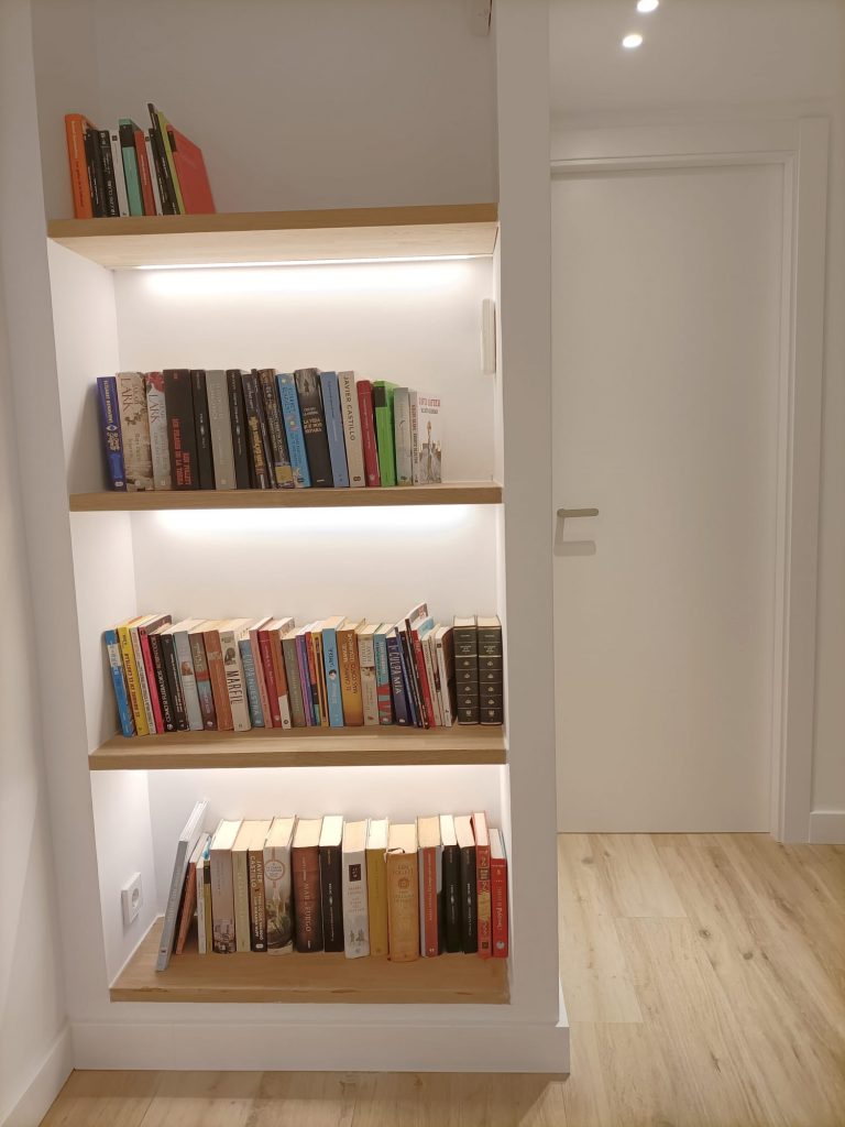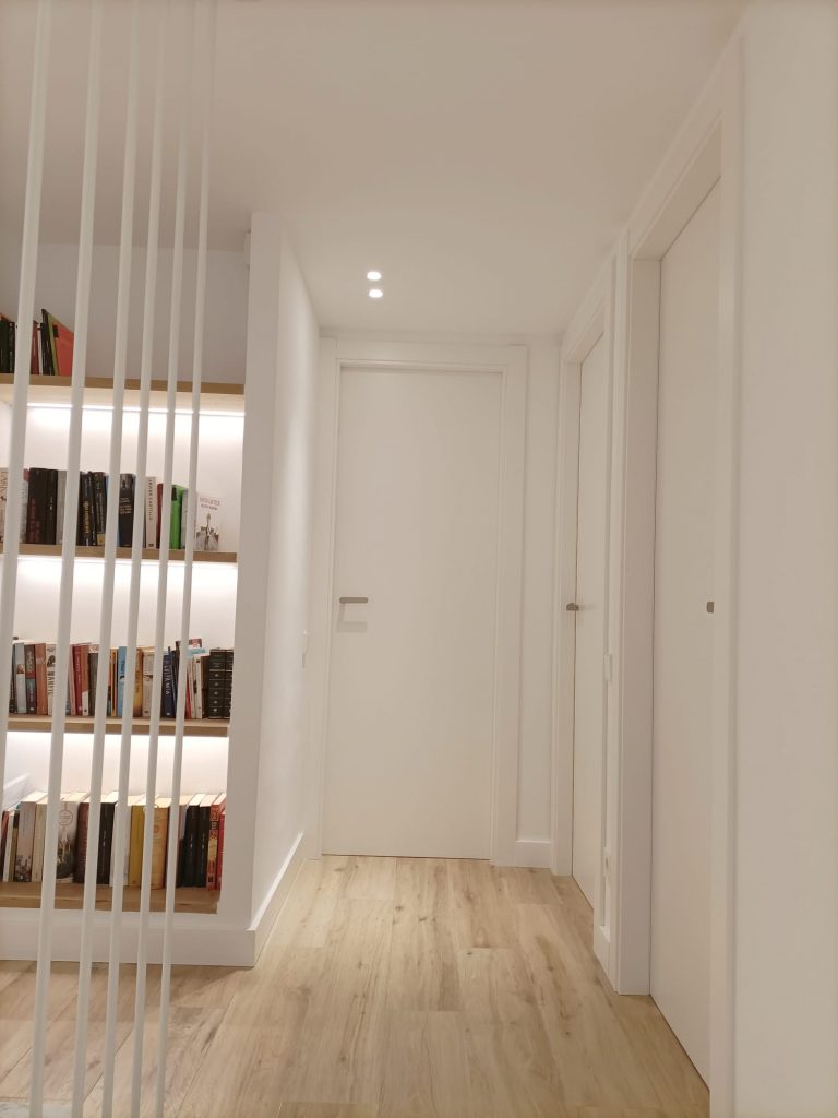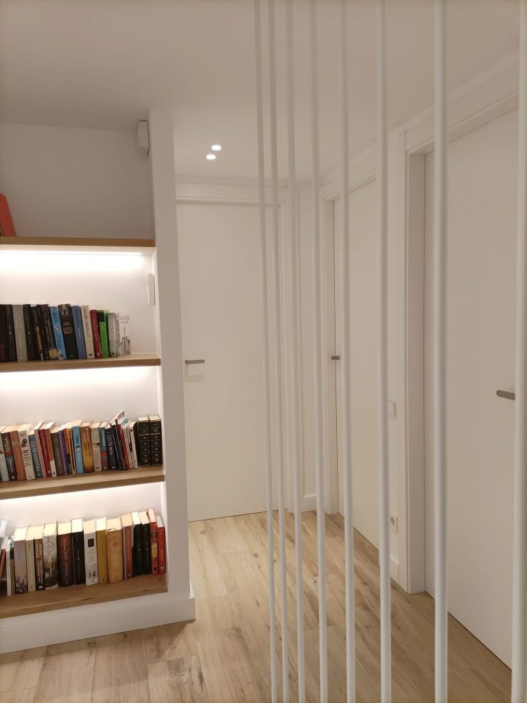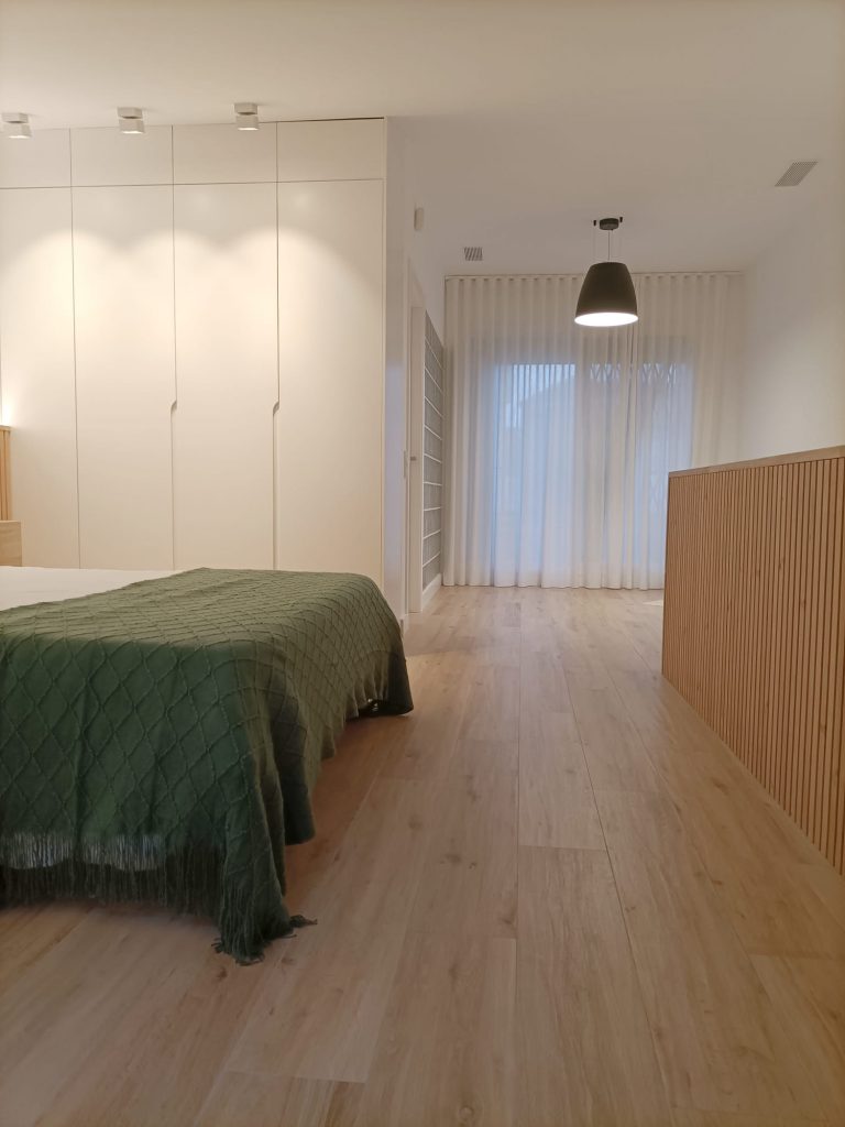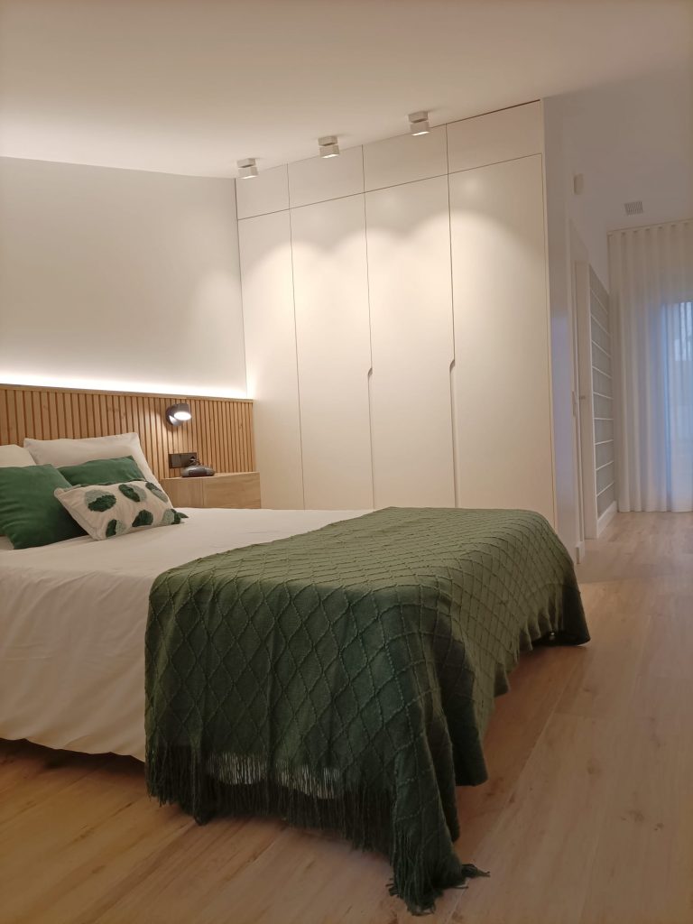 ¡El encanto de la madera en cada rincón de tu hogar! Desde el suelo hasta los detalles de mobiliario, hemos transformado este piso con la calidez y la belleza natural de la madera. Con suelo de parquet Finsa Roble Fado Gavia, cabezal de cama en haya natural y estantes de librería en haya natural, cada espacio respira elegancia y confort.