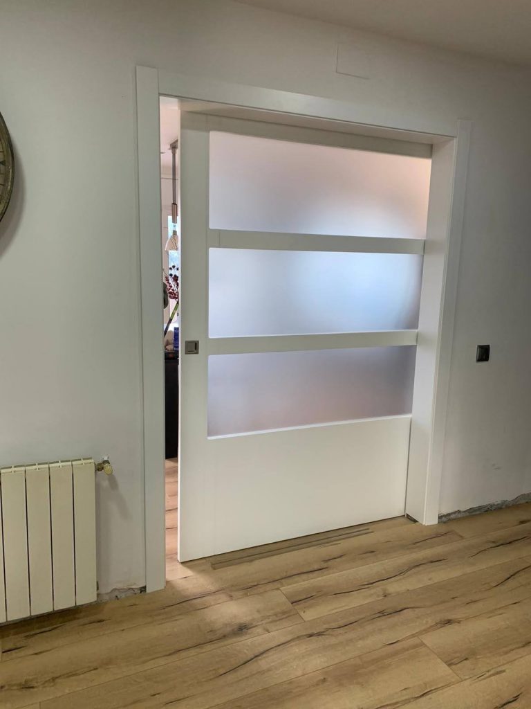 Puerta corredera lacada en blanco con tres cristales con medida especial
