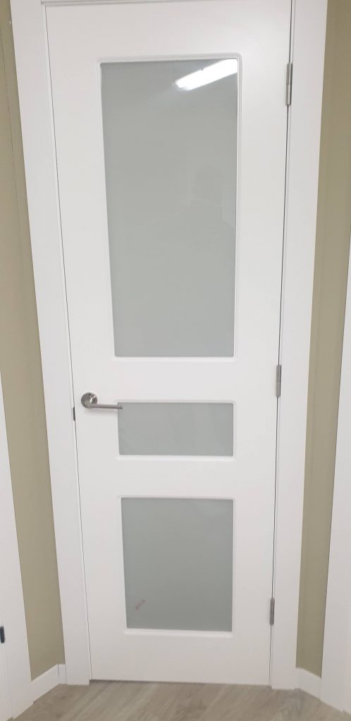 Puerta lacada en blanco con tres plafones de cristal opaco y moldura fresada.