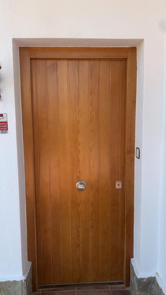 Puerta de entrada machihembrada en pino melis.