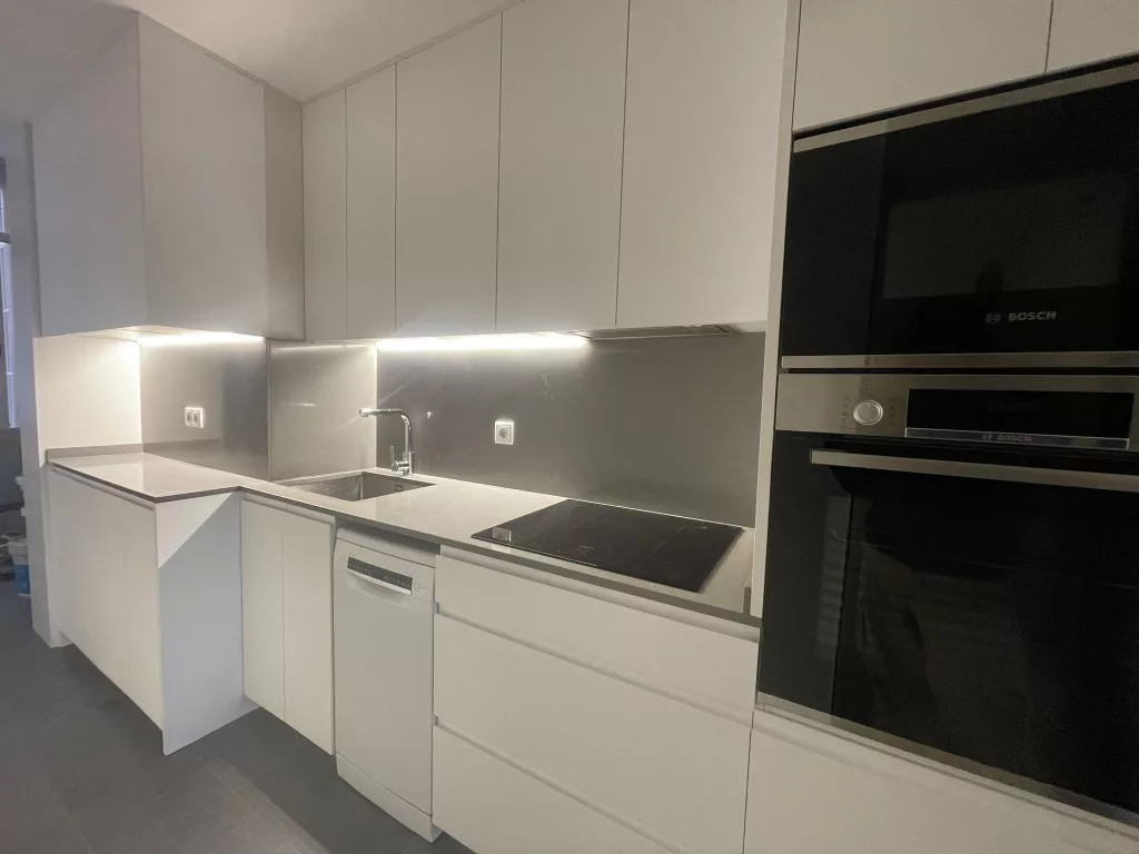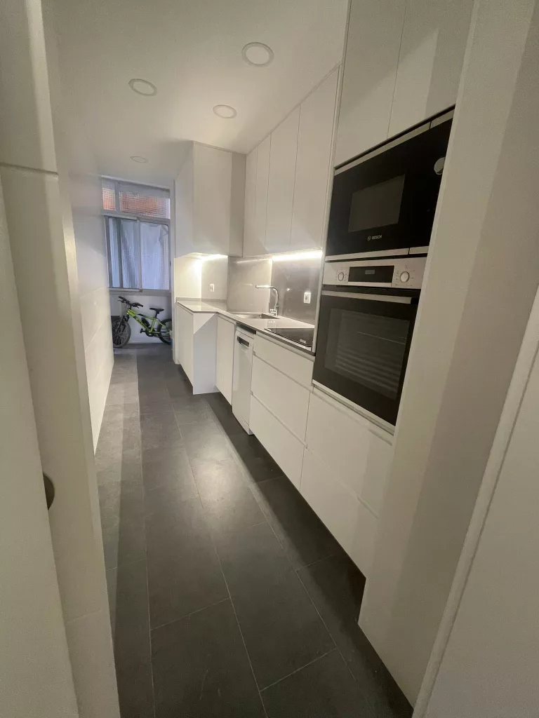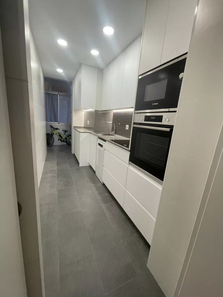 🍴 Cocina: Muebles blancos con tirador integrado y suelo en porcelánico gris, creando un espacio moderno y práctico.