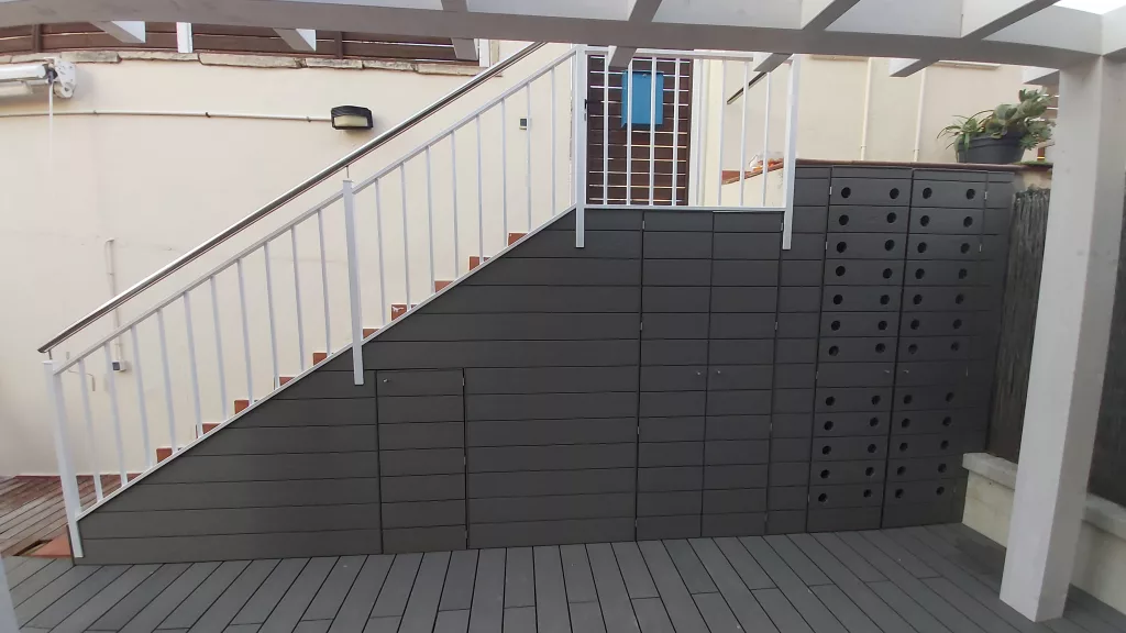 Tarima y pared fabricada con tecnológica NEWTECHWOOD ULTRASHIELD VINTAGE SILVER GREY.